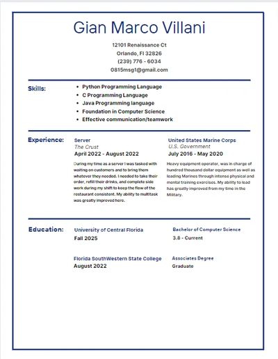 I have made a resume once before but it was completely geared towards something else that I had wanted to do in my life. Times have changed and I have had to make adjustments. My new resume was made in my ENC 3241 Technical Writing Class. I was explained the importance of a well organized and unique resume. It is a representation of you on paper with all your accomplishments so far. I learned that this is extremely important to keep up to date and make any changes necessary.